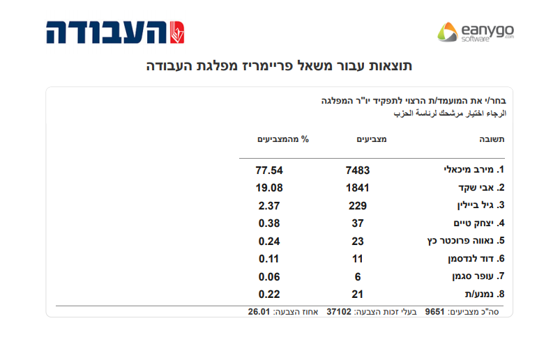 ח"כ מרב מיכאלי ניצחה היום בפריימריז של מפלגת העבודה ברוב של 77% מהקולות ותהיה ליו"ר המפלגה הבאה. מיכאלי היא האישה היחידה שתעמוד בראשות מפלגה בבחירות הקרובות. היא צפויה לנהל מו"מ על איחודים וחיבורים בגוש המרכז שמאל ולפי ההערכה במערכת הפוליטית תחבור למפלגת הישראלים של רון חולדאי. הפריימריז לרשימת העבודה ייערכו בשבוע הבא, יומיים לפני סגירת הרשימות.