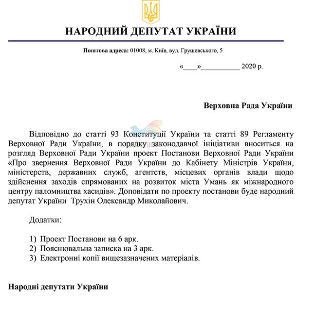 הדרישות לקידום התוכנית בפרלמנט: הכנת תוכנית מקיפה לפיתוח התיירות והעלייה לרגל בעיר אומן, תוכנית פיתוח וחידוש כלל התשתיות באזור קברו של רבי נחמן מברסלב. תוכנית לעידוד יזמים ומשקיעים על ידי מתן ערבויות מדינה במטרה לעודד יזמים להשקיע בפרוייקט, הכנת תכנון להקמת שדה תעופה בינלאומי באומן, שחזור בית הכנסת, מוזיאון היסטורי, ומקומות היסטוריים ליהודים, כולל שיפוץ ושימור אתרי מורשת והקצעתם למטרות היסטוריות, שיפור רמת בתי החולים והמוסדות הרפואיים באומן הכולל אספקת ציוד רפואי דרוש, תכנון הפעלת קווי אוטובוסים ורכבות חדשים שיחברו בין מרכזי אוקראינה וערים נוספות.