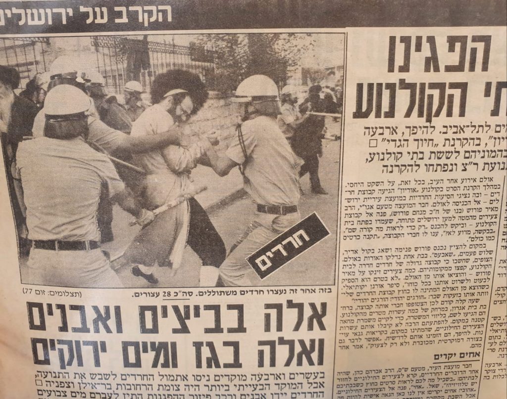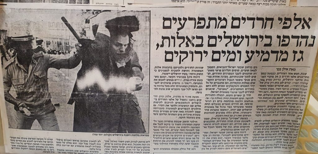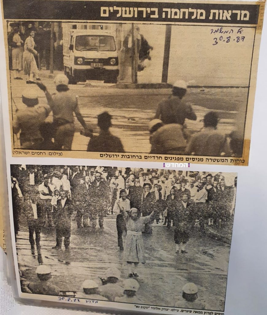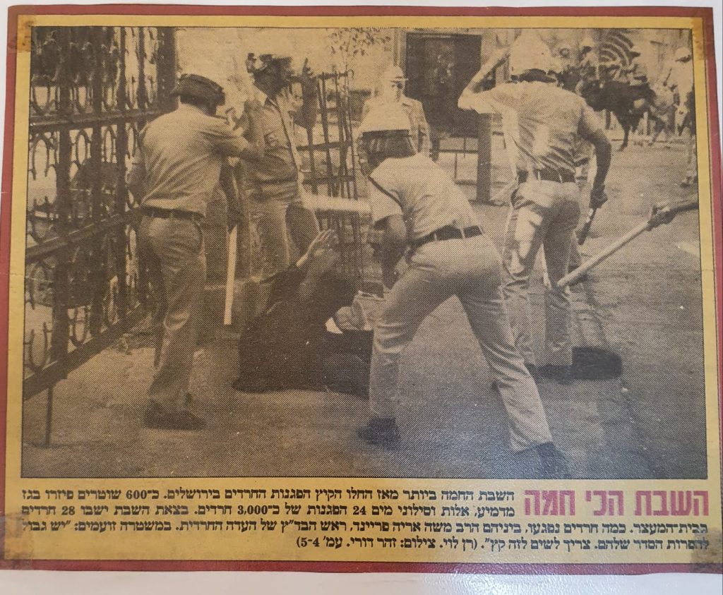 היה זה לפני כ-30 שנה. יצאתי בשבת אחה"צ מהבית להתפלל תפילת מנחה, באותה שעה התקיימה הפגנה בכביש בר אילן הסמוך, לפתע צצו מתוך מארב מתוכנן קבוצת שוטרים כשאלות בידיהם, ועצרו כל עובר אורח שעבר במקום, ביניהם עצרו גם אותי, (בתמונה) ברגע שביקשו להעלות אותי לניידת בעצם יום השבת, בכיתי והתחננתי לשוטרים שיקחו אותי ברגל ולא יעלו אותי לרכב בשבת, אך לא נענתי.
