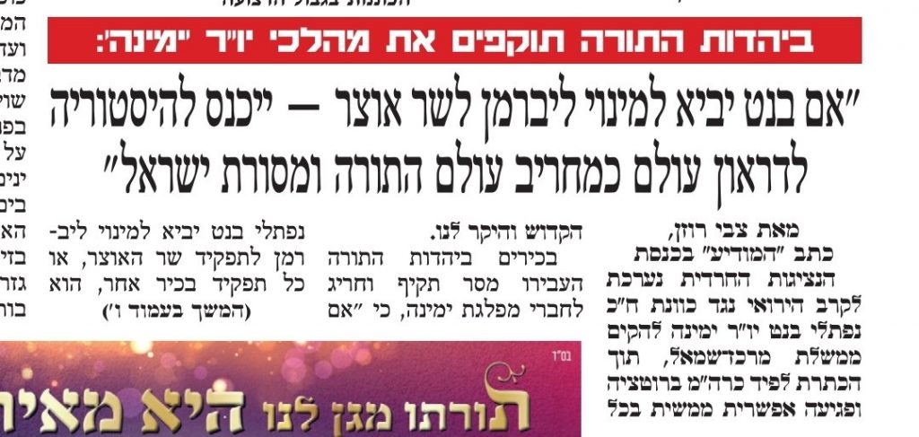 ברקע המגעים שמנהלים ראשי גוש השינוי להקמת ממשלה עם נפתלי בנט, הבוקר (שני) בכירים ביהדות התורה מעבירים מסר תקיף לכיוונו של יו"ר ימינה: "אם בנט יביא למינוי ליברמן לשר אומר – ייכנס להיסטוריה לדיראון עולם כמחריב עולם התורה", ההתקפה הגיע מעל גבי עיתון המודיע.