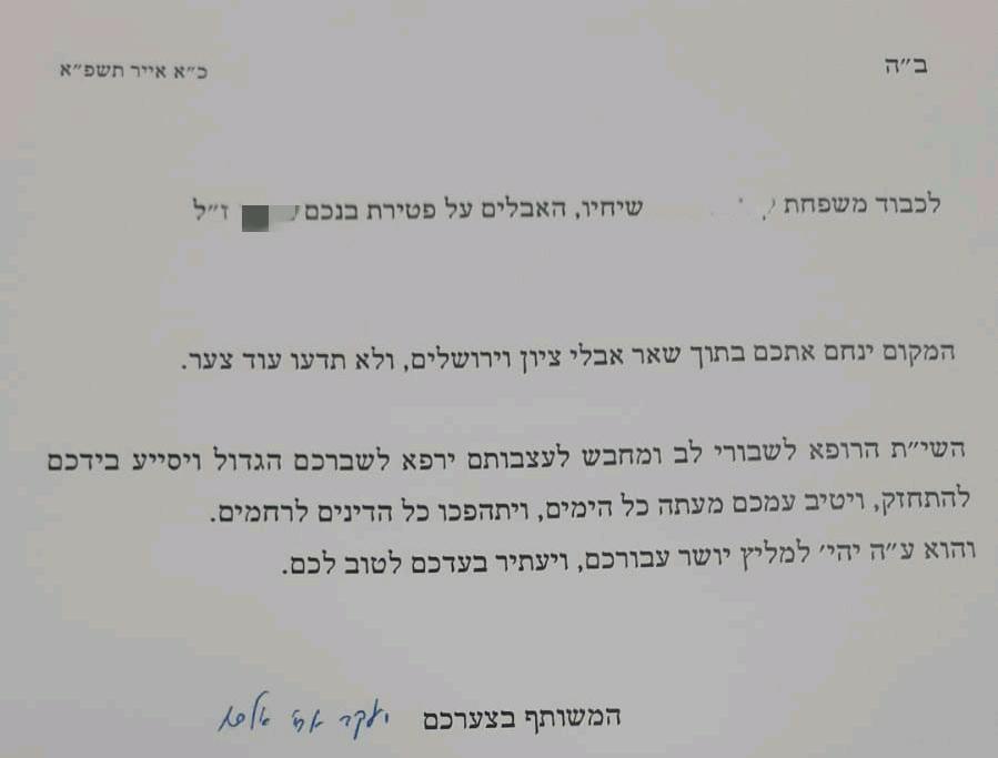 נוסח המכתב: "המקום ינחם אתכם בתוך שאר אבלי ציון וירושלים, ולא תדעו עוד צער. השי"ת הרופא לשבורי לב ומחבש לעצבותם ירפא לשברכם הגדול ויסייע בידכם להתחזק, ויטיב עמכם מעתה כל הימים, ויתהפכו כל הדינים לרחמים. והוא ע"ה יהי' למליץ יושר עבורכם , ויעתיר בעדכם לטוב לכם" חתימת האדמו"ר.