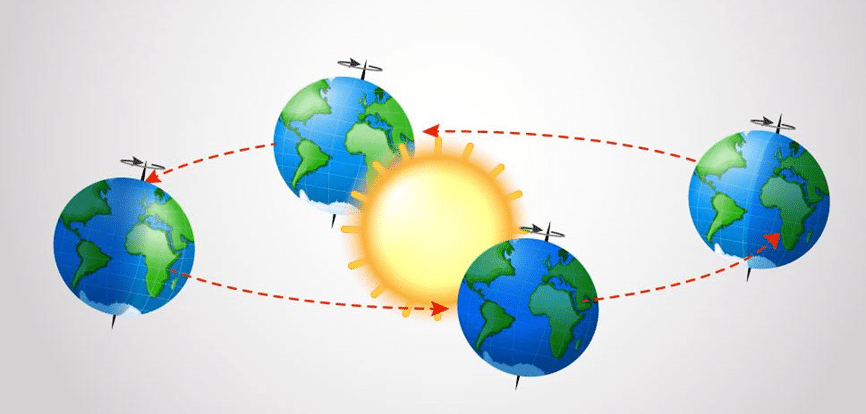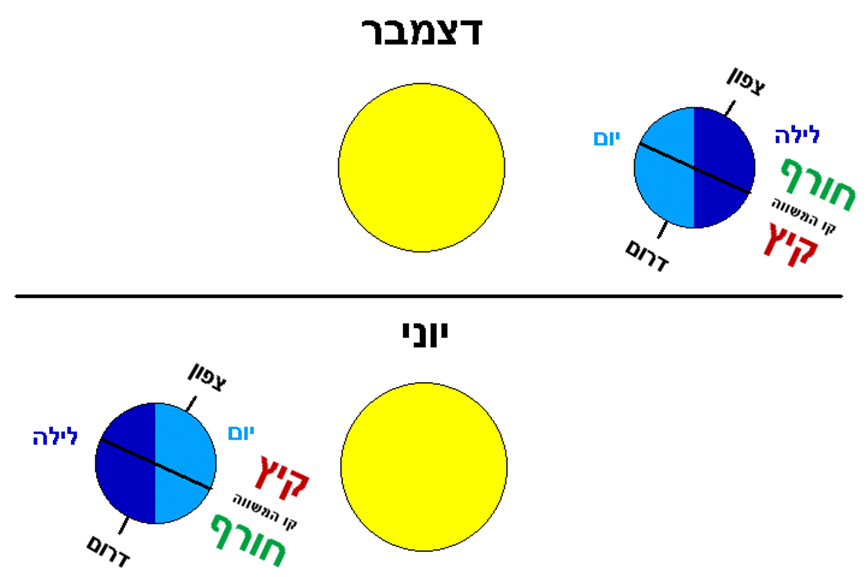 היום אנו יודעים שכדור-הארץ סובב סביב השמש, וסביב עצמו על ציר קבוע – כך שהקוטב הצפוני תמיד פונה לכוכב הצפון, החיצוני למערכת השמש. לכן, במסלול כדור הארץ סביב השמש, מצד אחד שלה נוטה ההמיספרה הצפונית שלו לכיוון השמש (איורים 1 ו-2) ולכן זוכה לקרינה ישירה, שמחממת אותה מאוד. אלה ימי הקיץ בחצי הכדור הצפוני. לעומת זאת, בהמשך מסלולו סביב השמש, בצד השני שלה נוטה ההמיספרה הצפונית לכיוון הנגדי מהשמש, ולכן זוכה לעוצמת קרינה נמוכה יותר. אלה ימי החורף בחצי הכדור הצפוני. הטייתו של כדור-הארץ משפיעה גם על משך הזמן ביממה בו יש אור, ולכן הימים בקיץ ארוכים יותר ובחורף קצרים יותר.