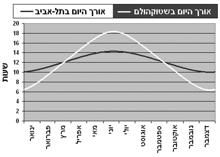 כדי יותר טוב להבין את הנושא להלן גרפים של אורכי יום ולילה בתל אביב ובשטוקהולם.