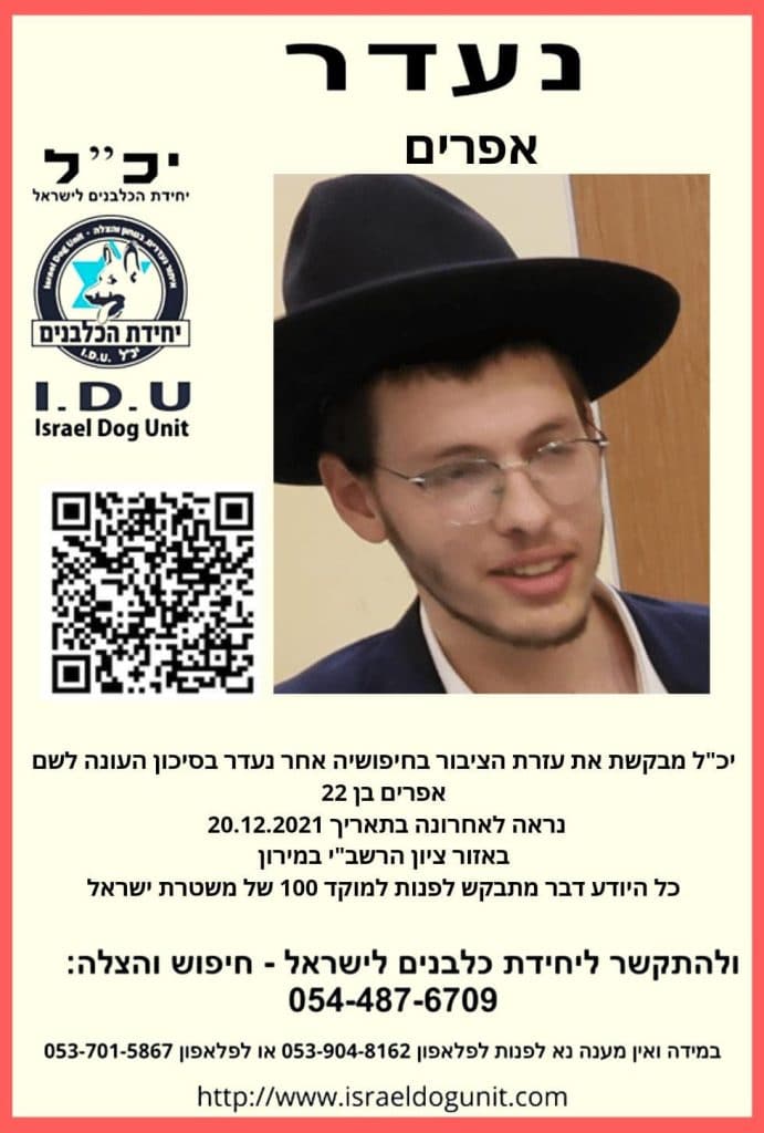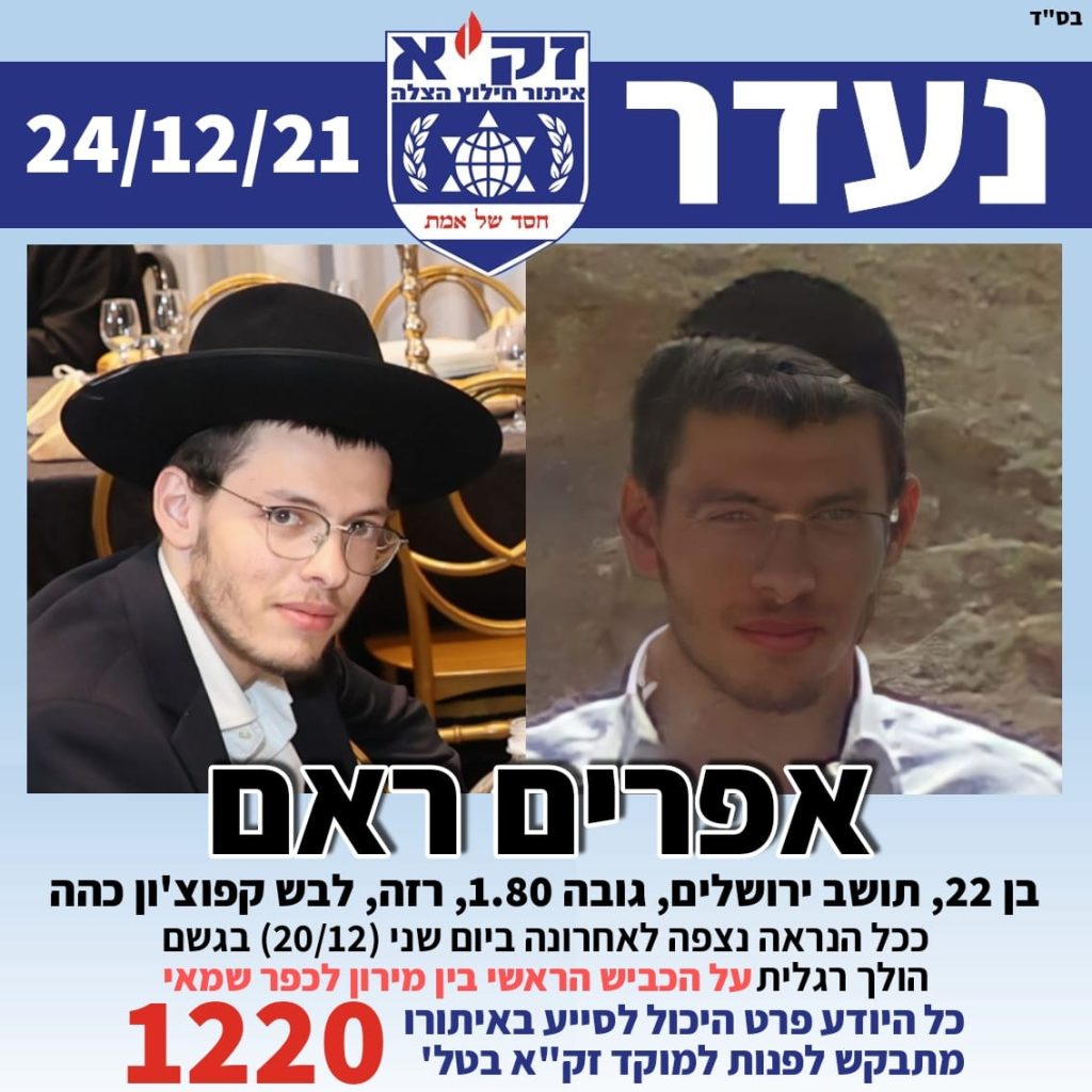 רגע לפני שבת ביכ"ל פונים לציבור בבקשת סיוע בהפצת תמונתו של הנעדר אפרים ראם, תושב ירושלים, כבן 22, שנעלמו עקבותיו בתאריך 20.12.2021 מאזור ציון הרשב"י במירון.