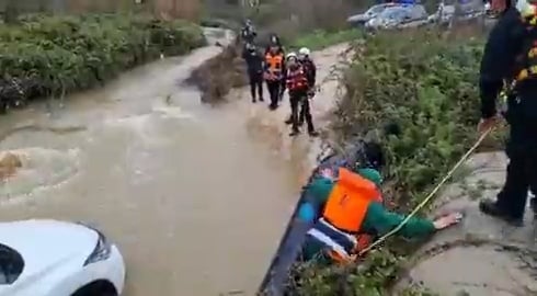 מכבאות והצלה נמסר כי סמוך לשעה 10:00 התקבל דיווח במוקד 102, על שני לכודים על גג רכב שנסחף בנחל שורק סמוך למוצא.