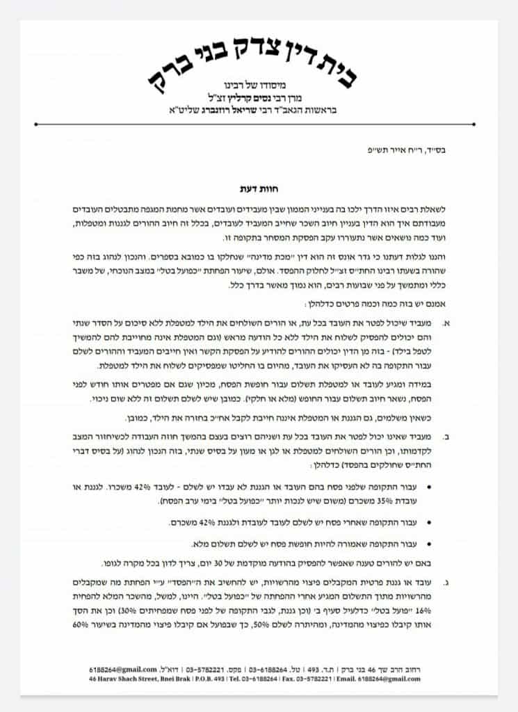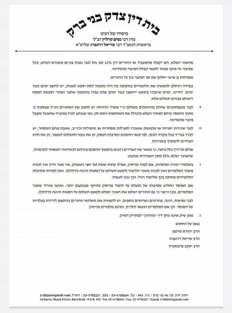 בעקבות אין סוף הפניות שהגיעו לחברי בד"ץ ב"ב ולחברי כל הבדצי"ם בעניין פתיחת מוסדות החינוך, יחסי עובד מעביד, תשלומים למוסדות החינוך, ומפעילי מעונות.