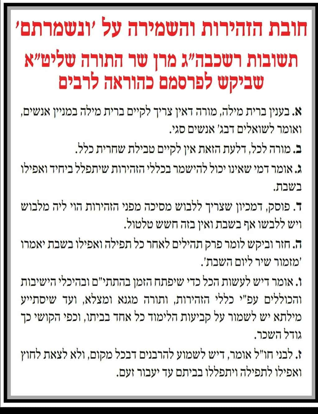 כמו"כ ג"כ התפרסם שו"ת הלכתי ממרן שר התורה שליט"א לימי הקורונה.