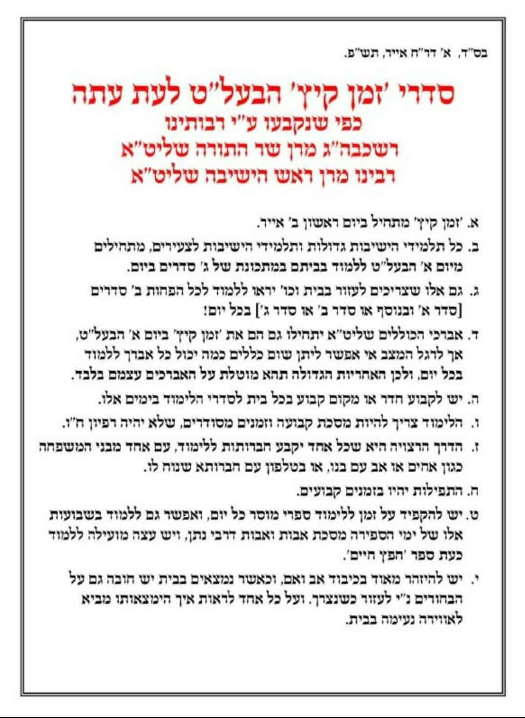 וכן מתפרסם הבוקר ב'יתד' מכתבם המשותף של מרן שר התורה שליט"א ומרן ראש הישיבה שליט"א בעניין סדרי זמן קיץ בהיכלי הישיבות