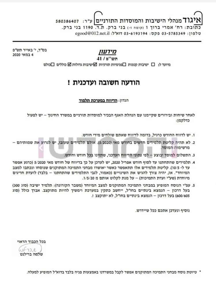 כתב 'המחדש' בדק ומצא כי היום (שני) י' אייר נשלח לישיבות מסמך רשמי בו נכתב כי "לא תהיה קליטת תלמידים חדשים בחודש מאי"