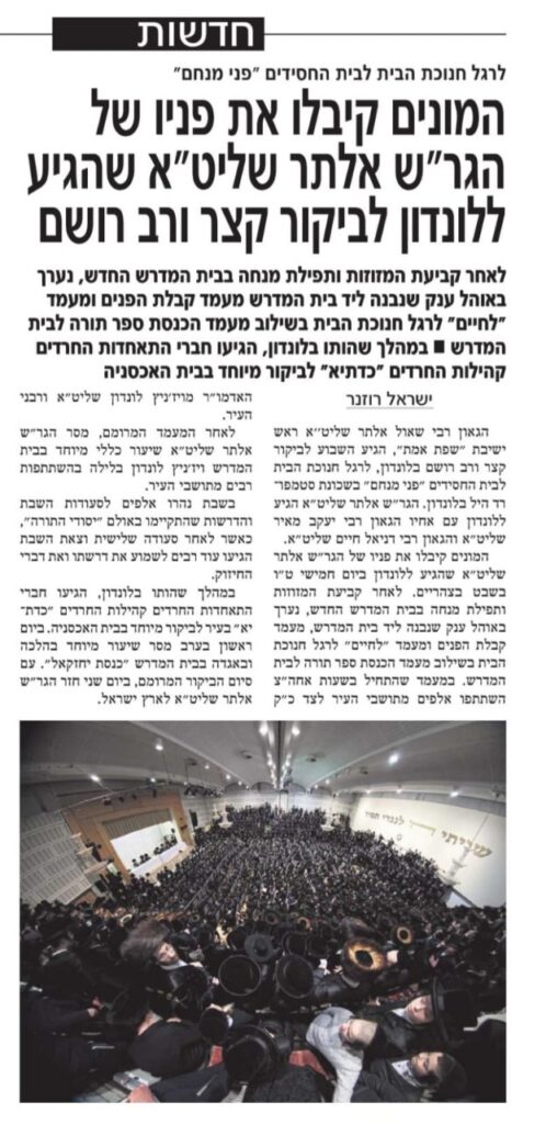 תחת הכותרת, "לרגל חנוכת הבית לבית החסידים "פני מנחם" המונים קיבלו את פניו של הגר"ש אלתר שליט"א שהגיע ללונדון לביקור קצר ורב רושם", סיקר הביטאון מרשים מביקורו של הרב אלתר בלונדון. עד היום מיעט העיתון לתת ביטוי לרב אלתר, כחלק מהכבוד שנתנו לחסידות גור ולאדמו"ר, אבל הבוקר נראה שגם זה נפרץ