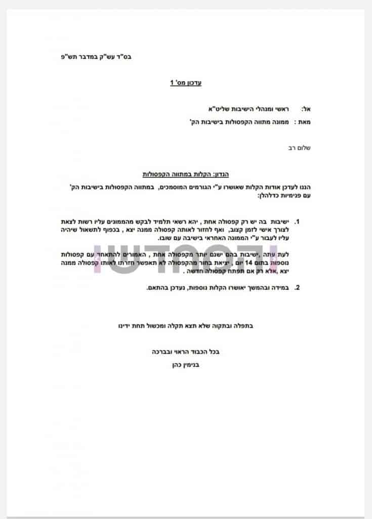את מסמך ההקלות שיגר בשעה האחרונה מנהל מתווה הקפסולות בישיבות החרדיות הרב בנימין כהן, שכתב את המסמך תוך התייעצות עם גדולי ישראל ובתוספת אחריות לשלום הבחורים.