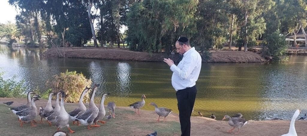 ורחמיו על כל מעשיו: הפרשן ישראל כהן נצפה מאכיל ברווזים בפארק הלאומי תוך כדי שהוא מתעדכן משמערל על סיפורי הפלג.