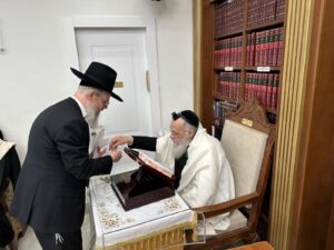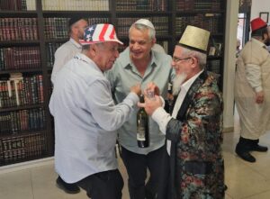 ראש עיריית כפר יונה אלברט טייב ומנכ"ל העירייה צביקה ימין, בשמחת הפורים בביתו של המרא דאתרא הגאון רבי יוסף הללויה