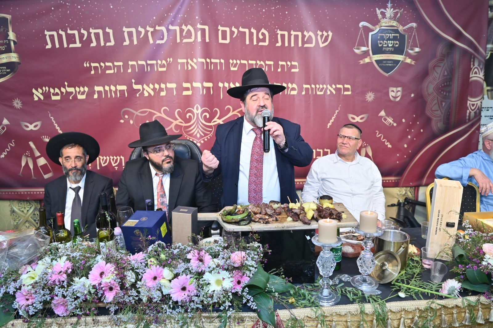 מאות תושבים, מבוגרים וצעירים כאחד, התכנסו ביום חמישי האחרון לאירוע פורים מרכזי בנתיבות שנערך בבית מדרשו של הגאון הרב דניאל חזות שליט"א, אב"ד 'טהרת הבית' ורב שכונת נווה שרון.