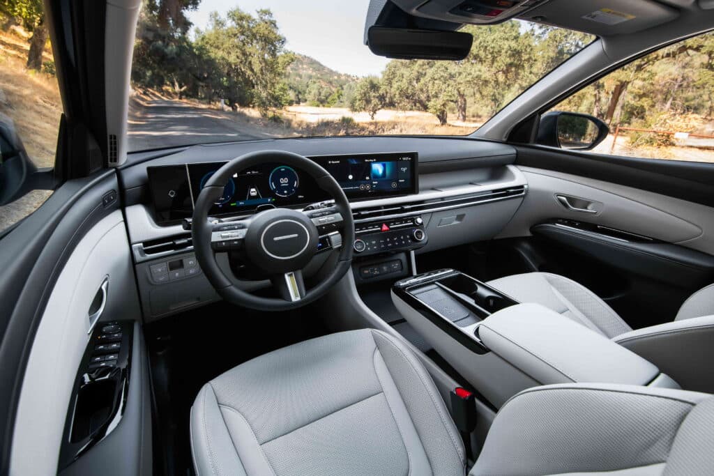 תא הנהג של הטוסון החדש מושפע באופן ברור מהאיוניק 5, מודל הדגל החשמלי של יונדאי. הקונסולה המרכזית מציגה קווים מודרניים ונקיים, ובדגמים המתקדמים מותקנים שני מסכים דיגיטליים בגודל 12.3 אינץ' כל אחד.