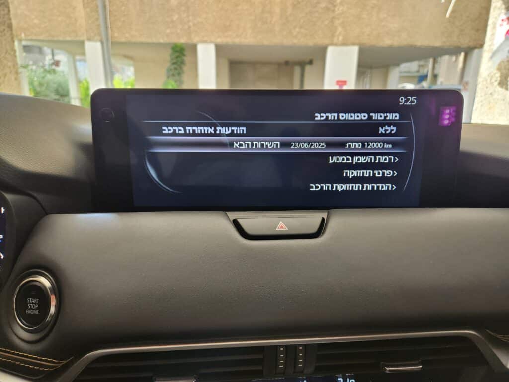תא הנוסעים של ה-CX-90 מצויד בטכנולוגיה מתקדמת, אך כאן מגיעה גם נקודת הביקורת העיקרית שלי. המסך המרכזי גדול ואיכותי (10.25 אינץ'), אך בניגוד לרוב המתחרים בקטגוריה, אינו מסך מגע. מאזדה עדיין דבקה בפילוסופיית התפעול באמצעות חוגה ולחצנים בקונסולה המרכזית.