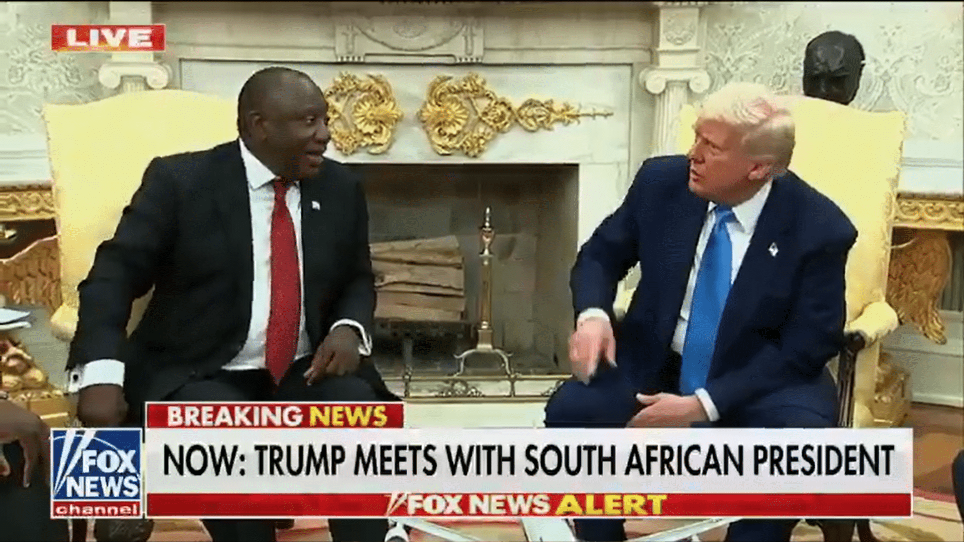 במהלך פגישהשהתקיימה הערב (שעון ישראל) בבית הלבן, נשיא ארה"ב דונלד טראמפ ארגן 'אמבוש' מיוחד כאשר הורה לצוותו להציג בפני נשיא דרום אפריקה סיריל רמפוזה סרטונים שלטענתו מתעדים פגיעה בתושבים לבנים במדינה האפריקאית.