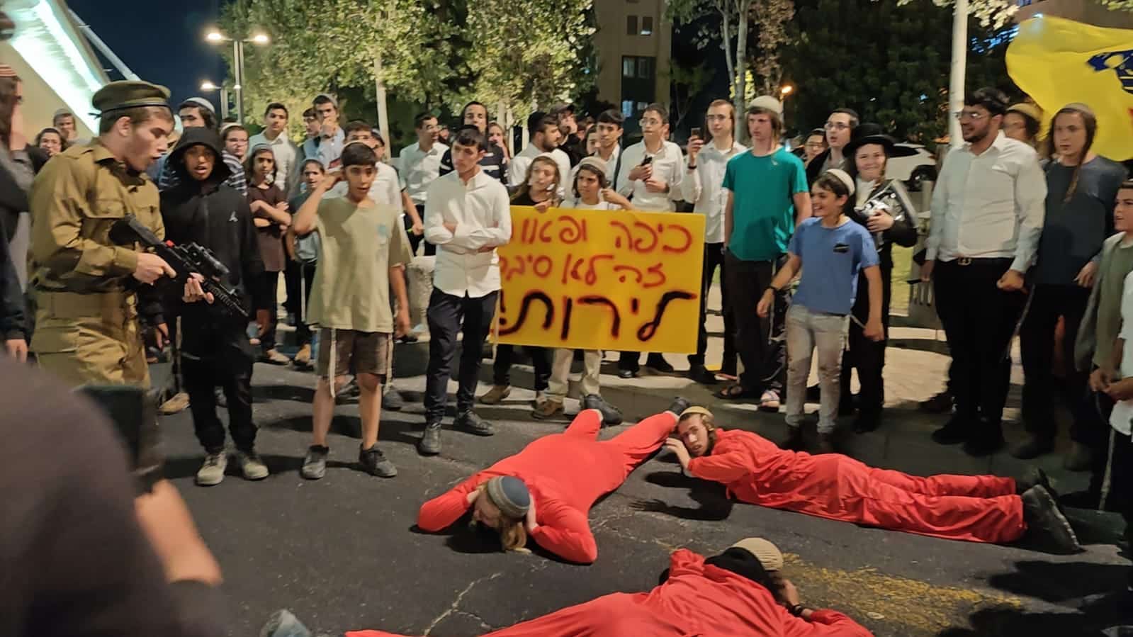 עשרות פעילי התיישבות חסמו הערב (חמישי) את הכניסה לעיר ירושלים. חלק מהמפגינים לבושים בגדים אדומים המזכירים את בגדי הנידונים למוות ומולם לובשי מדים שכביכול יורים בהם למוות.