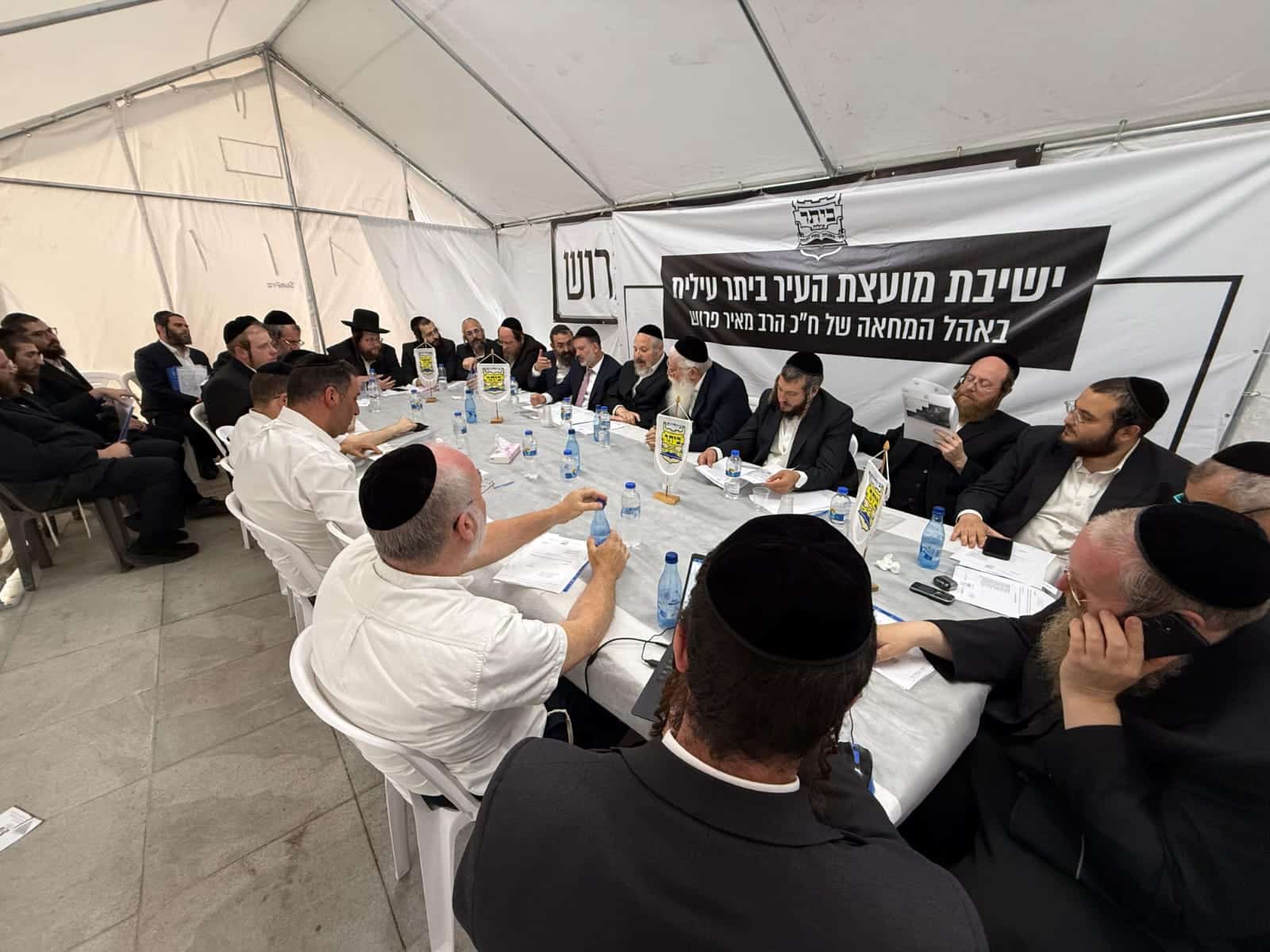 ישיבה מיוחדת של מועצת העיר ביתר עילית התקיימה היום (שלישי) בלשכת המחאה של ח"כ מאיר פרוש מתחת משרדה של היועמ"שית, לחיזוק המחאה נגד ההתעמרות בלומדי התורה בארץ ישראל.