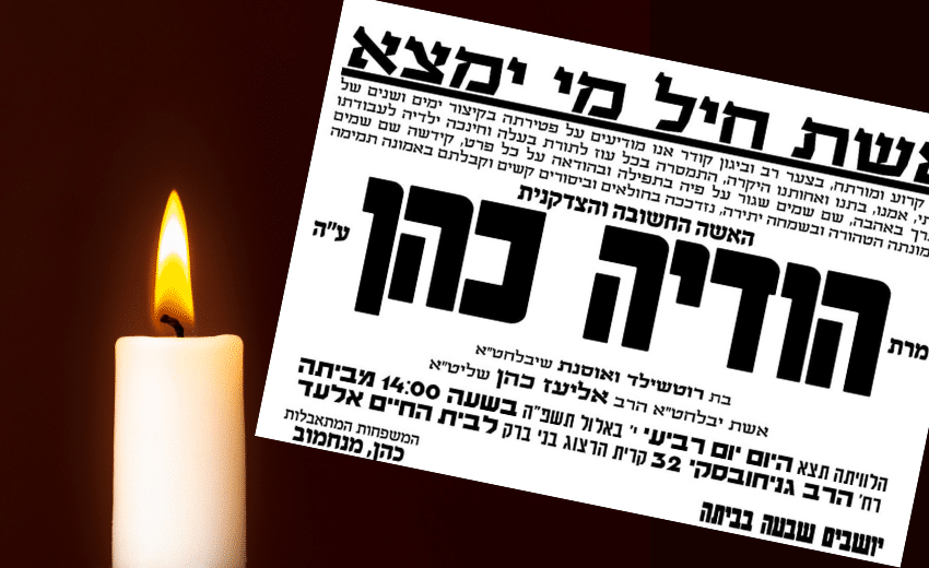 אבל כבד ירד על שכונת קרית הרצוג בבני ברק. האישה החשובה והצדקנית, הגב' הודיה כהן ע"ה, הלכה לעולמה בבית החולים 'מעיני הישועה' כשהיא בת ארבעים בלבד. בכך נותרו בעלה האברך וששת ילדיה היתומים כשהם שבורים ורצוצים, עודם מתאבלים על פטירתו הפתאומית של אהרן הקטן ז"ל, בן שלוש בלבד, שנפטר בפתאומיות ביום הולדתו בשנה שעברה.