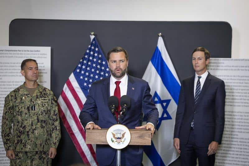 סגן נשיא ארצות הברית, ג'יי. די. ואנס, קיים הערב (שלישי) מסיבת עיתונאים מיוחדת במפקדה האמריקנית שהוקמה בקריית גת לצורך פיקוח על יישום ההסכם בין ישראל לחמאס. ואנס העריך כי "אנחנו שבוע בתוך תוכנית השלום ההיסטורית של טראמפ, והדברים מתקדמים יותר טוב ממה שחשבנו".