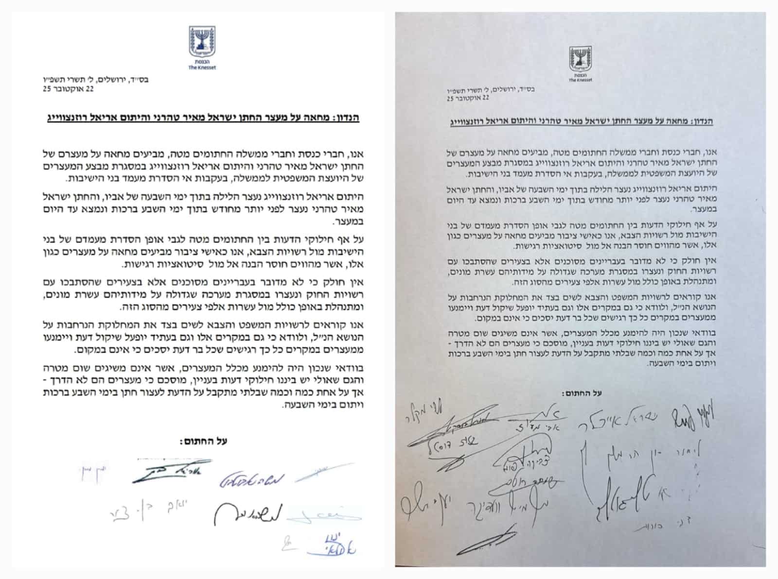 על המכתב חתמו בינתיים חברי הכנסת: משה אבוטבול, ינון אזולאי, ישראל אייכלר, יעקב אשר, משה ארבל, אוריאל בוסו, מישל בוסקילה, חיים ביטון, יואב בן צור, טלי גוטליב, משה גפני, גלית דיסטל, מיכל ולדיגר, יוסי טייב, מיכאל מלכיאלי, אבי מעוז, אורי מקלב, יעקב מרגי, יוני משריקי, צבי סוכות, לימור סון הר מלך, צביקה פוגל, מאיר פרוש, שמחה רוטמן.