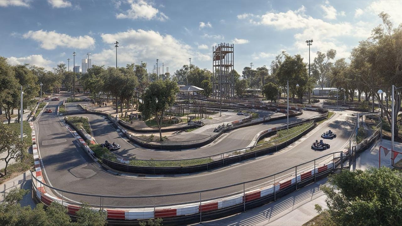 במרכז הפארק יוקם מתחם קארטינג מקצועי, ברמה הדומה למסלולים הבינלאומיים, עם מסלולי נסיעה בטוחים, מערכת תזמון מתקדמת ומסלולים מותאמים. סביבו יוקמו מתקני אקסטרים חדשניים. לצד אלה ייבנה קיר טיפוס ענק בעל מסלולים ברמות קושי מגוונות, המתאים החל מילדים ועד מטפסים מנוסים, וכן אומגות ארוכות במיוחד, שנבנות בסטנדרט בטיחות בינלאומי ומאפשרות גלישה חווייתית לאורך עשרות מטרים. כל אלה ישתלבו בתוך רחבות משחק רחבות־היקף, הפזורות ברחבי הפארק ומציעות מתקנים לכל גיל – לקטנטנים, לילדים, לנוער ולמשפחות.