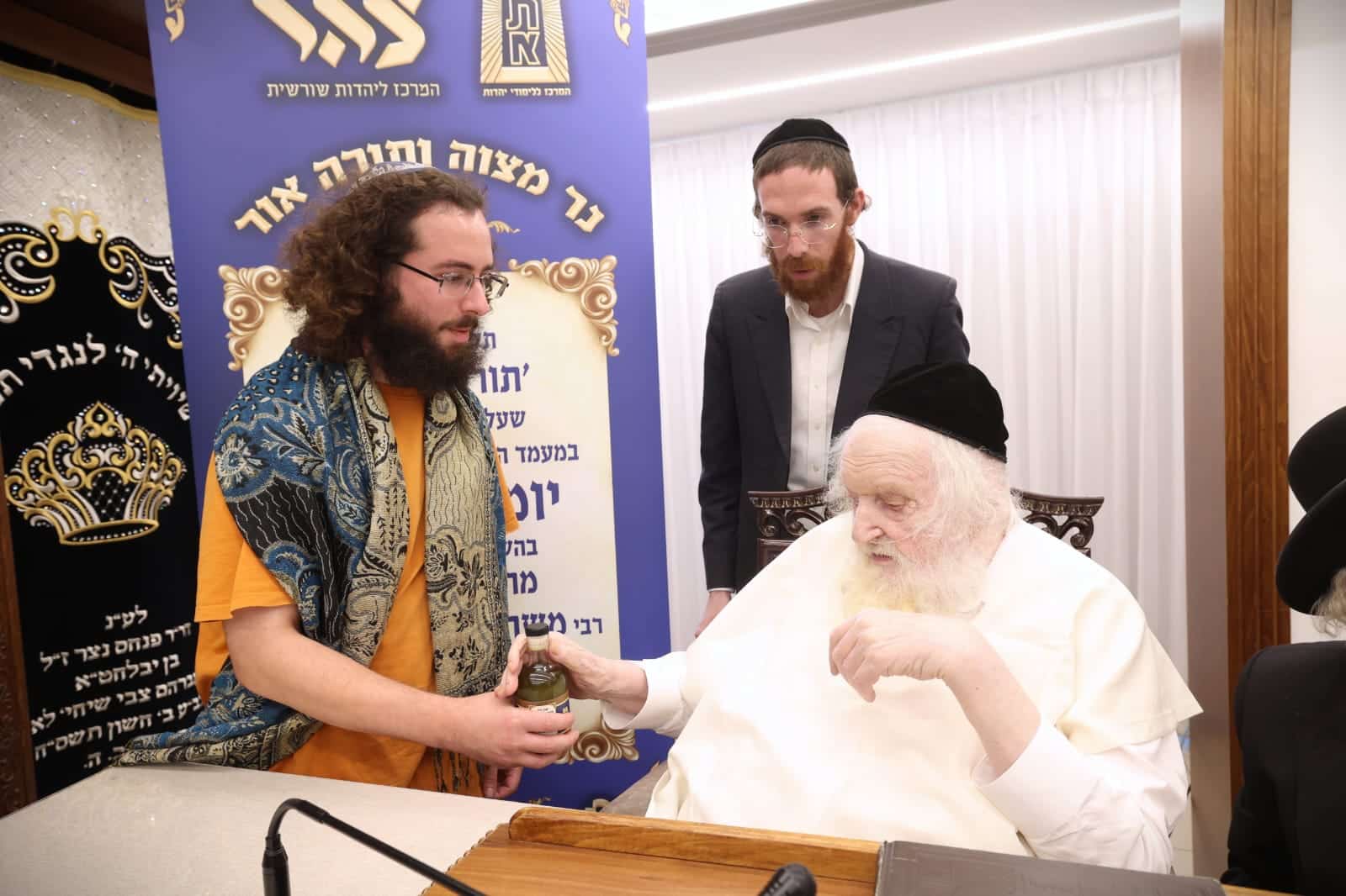 התרגשות רבה אחזה בתלמידים בעת שעברו התלמידים בזה אחר זה לפני הרב, אשר העניק וחילק בידו הקדושה לכל אחד מהתלמידים בקבוק שמן זית זך וטהור, שנתברך במיוחד על ידו להדלקת נר חנוכה, בצירוף ברכה אישית חמה לכל אחד להצלחה וסייעתא דשמיא. הבחורים קיבלו את השמן כמטמון יקר, מתוך הרגשה עילאית של זכייה לברכה ולישועה, וכסגולה לשמירת פך השמן הטהור שבנשמה.