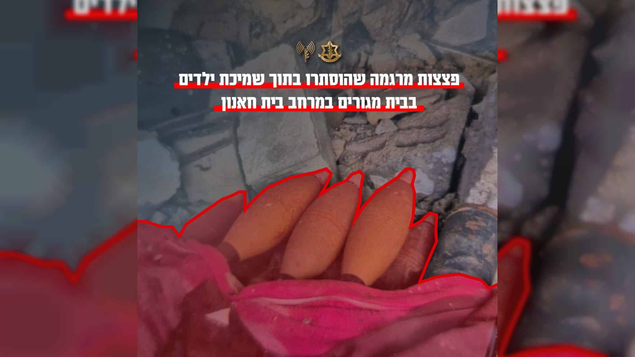 עדות נוספת לשימוש הציני של חמאס באוכלוסייה אזרחית נמצאה בבית מגורים בבית חאנון: במהלך סריקות, איתרו הלוחמים כ-10 פצצות מרגמה שהוסתרו בקפידה בתוך שמיכת ילדים בחדר מגורים.