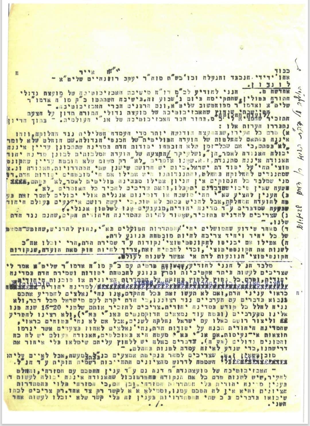 'המבשר' חושף מסמך דרמטי בו מדווח ראש אגודת ישראל הרב יצחק מאיר לוין זצ"ל במכתב מיוחד מפולין למוה"ר יעקב רוזנהיים זצ"ל בשנת תרח"צ על הדיון של מועצת גדולי התורה בפולין בנושא התזכיר שהוגש ע"י אגודת ישראל ירושלים לוועדת החלוקה בנוגע לארץ ישראל.