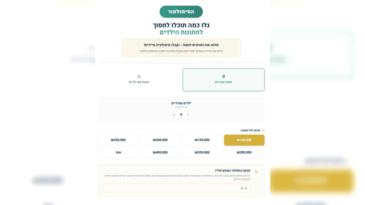 הסימולטור החדש של 'משיאים' הוא כלי תקדימי שמאפשר לכם לגבש את האסטרטגיה הנכונה ביותר עבורכם לנישואי הילדים, תוך שקלול מתקדם שמבטיח עידן חדש לגמרי בעולם נישואי הילדים, לוקח בחשבון את התנאים הספציפיים שלכם, ההעדפות שלכם, והכל תוך הצגת התהליך כולו בשקיפות מלאה ובליווי אנשי המקצוע הטובים ביותר.