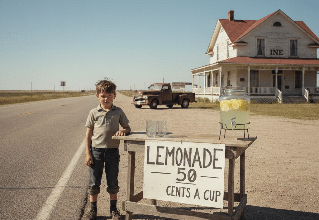 במוחו הצעיר נרקמה תוכנית. הוא נטל דוד גדול, סחט לתוכו לימונים טריים בדבקות, ערבב מים וסוכר, ובשארית כוחותיו גרר שולחן קטן אל שולי הכביש הלוהט. בכתב יד ילדותי וגדול הכין שלט: "לימונדה קרה – חצי דולר לכוס".