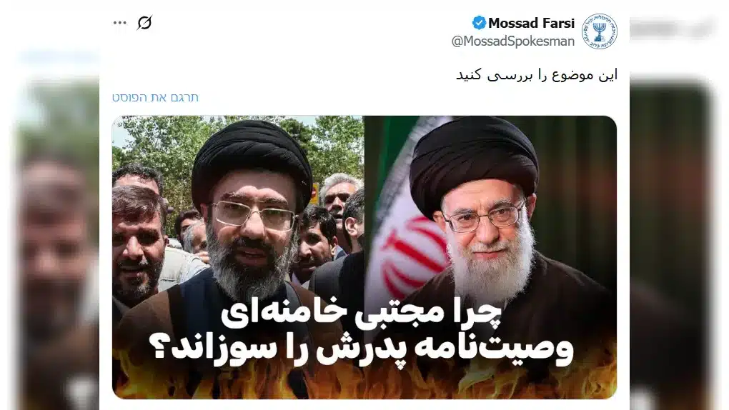 המוסד פתח היום (ראשון) חזית תודעתית ישירה מול יורשו המיועד של עלי חמינאי, בנו מוג'תבא. בחשבון ה-X הרשמי של המוסד בשפה הפרסית פורסמה תמונה של האב והבן, ועליה שאלה אחת מהדהדת: "למה מוג'תבא חמינאי שרף את צוואת אביו?". המסר המרומז מצביע על כך שהבן, ששרד את ניסיון החיסול בשבת האחרונה אך איבד בה את מרבית משפחתו (כולל אביו, אמו ואשתו), השמיד לכאורה מסמך רשמי המפרט את רצונו האחרון של המנהיג המנוח – ייתכן משום שזה לא ייעד אותו לירושה או שכלל הנחיות שאינן משרתות את מטרותיו.