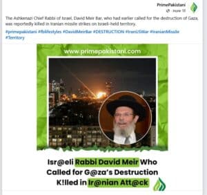 03:00 | פייק: דיווח פקיסטני טוען כי הרב הראשי לישראל הרב קלמן בר, נהרג מירי הטילים.