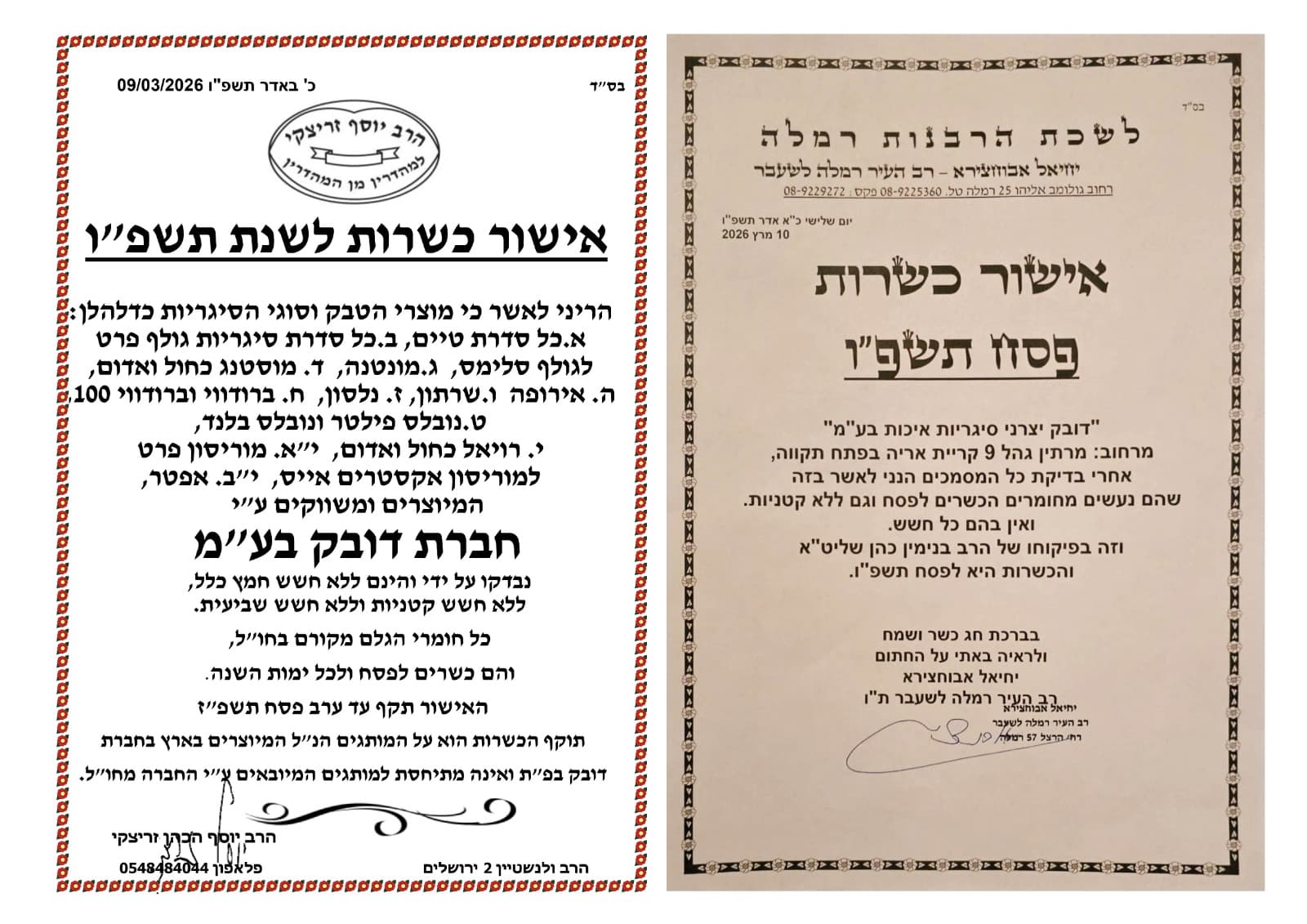 הסיגריות המוזכרות מיוצרות ומשווקות ע"י חברת דובק בע"מ, נבדקו והינן תחת השגחה מהודרת ללא חשש חמץ כלל, ללא חשש קטניות וללא חשש שביעית.