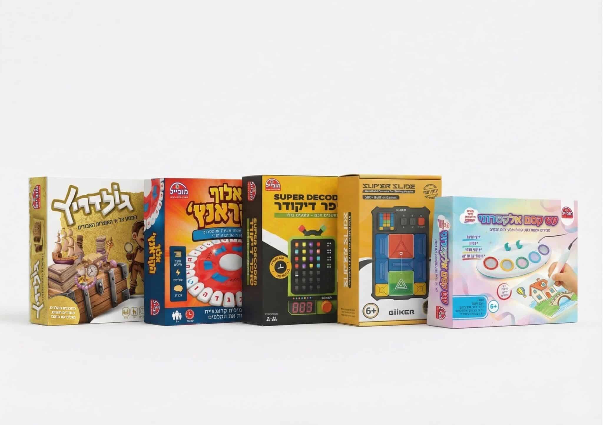 - סופר סלייד: מכשיר קומפקטי עם מעל 500 חידות היגיון. זהו משחק שקט, אישי ומרתק בצורה בלתי רגילה, שגורם לילד לשבת בריכוז עמוק ולפתור אתגרי סליידרים עד להצלחה. מושלם לזמני המתנה או לשעות המנוחה בבית.