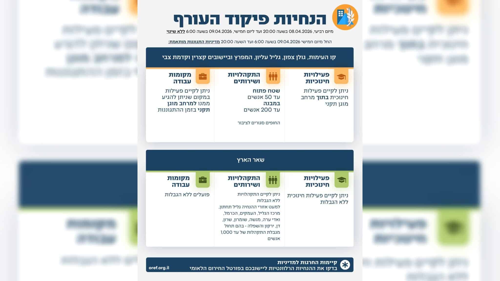 על רקע כניסתה לתוקף של הפסקת האש עם איראן, פיקוד העורף עדכן הערב (רביעי) את ההנחיות המבשרות על חזרה הדרגתית לשגרה במרבית חלקי הארץ. לפי העדכון, החל ממחר, יום חמישי ה-9 באפריל 2026 בשעה 6:00 בבוקר, יבוטלו מרבית ההגבלות ומרבית המדינה תוגדר כ"אזור ירוק". בצה"ל מבהירים כי עד לשעה זו תישאר מדיניות ההתגוננות הנוכחית ללא שינוי, אך עם שחר תשונה המדיניות בכפוף להערכת המצב. מדובר צה"ל נמסר כי: "צה״ל ממשיך לעקוב אחר ההתפתחויות ובהתאם להערכת מצב שוטפת בפיקוד העורף, הוחלט לעדכן את מדיניות ההתגוננות."