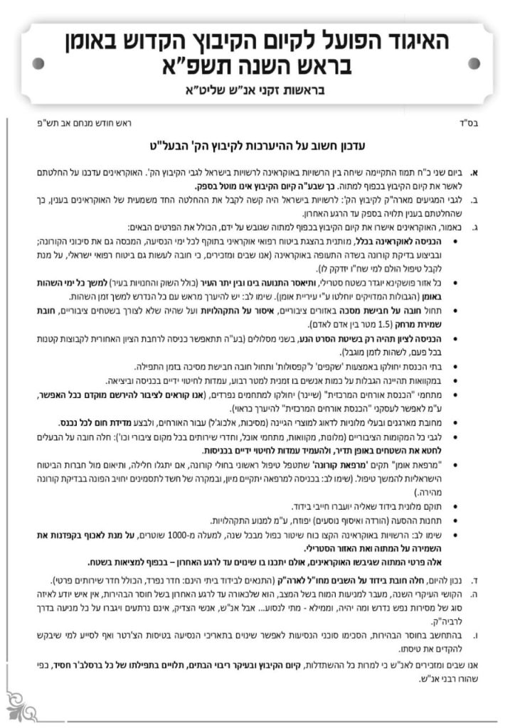 לאחר מגעים ארוכים, עליות ומורדות בין רשויות אוקראינה לעסקני ורבני ברסלב, ממשלת אוקראינה אישרה היום את המתווה המיוחד בעקבות נגיף הקרונה, הדברים הנאמרים במתווה שהתגבש יחד עם חסידי ברסלב.
