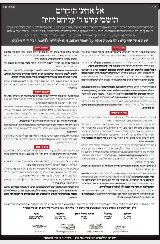 את מכתבם המיוחד חותמים גדולי ההוראה "הכותבים וחותמים ביראה וחרדה לשלום אחב"י, בתפילה ותחינה כי בזכות שמירת הגוף והנפש וצער אלו הימים, יתמלא השי"ת רחמים על שארית ישראל לגאלנו גאולת עולם ויזכנו לשוש עם ירושלים משוש, והמתאמצים בזה ירחמם ק-ל מלך רופא נאמן שתתמיד בריאותם הם ובני ביתם אכי"ר"