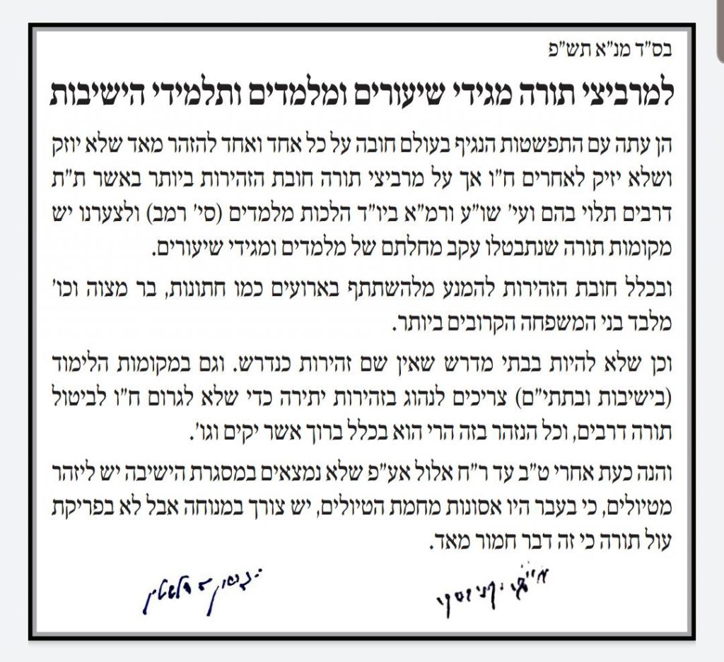 "למרביצי תורה מגידי שיעורים ומלמדים ותלמידי הישיבות, הן עתה עם התפשטות הנגיף בעולם חובה על כל אחד ואחד להזהר מאד שלא יוזק ושלא יזיק לאחרים ח"ו אך על מרביצי תורה חובת הזהירות ביותר באשר ת"ת דרבים תלוי בהם ועי' שו"ע ורמ"א ביו"ד הלכות מלמדים (סי' רמב) ולצערנו יש מקומות תורה שנתבטלו עקב מחלתם של מלמדים ומגידי שיעורים
