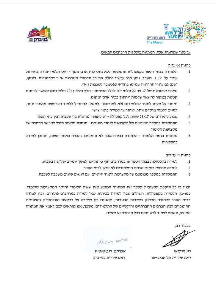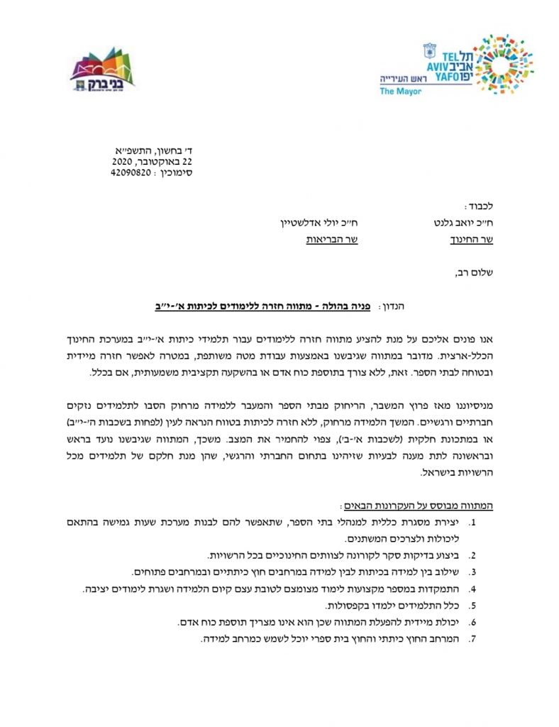ראש עיריית בני ברק הרב אברהם רובינשטיין וראש עיריית תל אביב- יפו רון חולדאי יוצאים הבוקר (ה') בקריאה משותפת למשרדי החינוך והבריאות להחזיר מיידית את הלימודים ומציגים מתווה המיועד לכיתות א'-יב ועומד בתנאי משרד הבריאות.