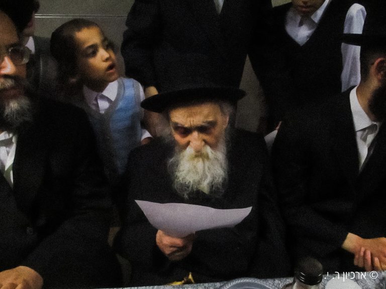 גלריה: האדמו"ר ממבקשי השם בטיש ט"ו בשבט בהיכל בית מדרשו בשיכון ו' בבני ברק. נראה הגבאי המסור ר' דוד וויס