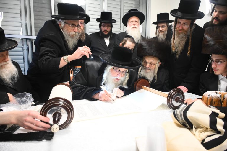 מעמד הכנסת ספר תורה בקרית צאנז נתניה בראשות כ"ק מרן האדמו"ר מצאנז שליט" אנדבת הרה"ח ר' מרדכי שפירא הי"ו מקרית צאנז נתניה | צילום: משה גולדשטיין