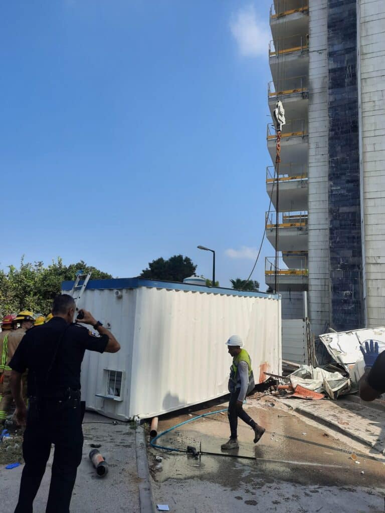תאונת עבודה קטלנית בצפון: המכולה ששימשה כמעלית התנתקה בקומה ה-12 ונפלה על קרוואן שעליה ישבו באותה עת כמה פועלים • מותם של שניים מהם נקבע במקום • מבדיקת המשטרה עולה כי כשל טכני הביא לניתוק המעלית ולצניחה שלה מהקומה ה-12 על שתי מכולות שהיו זו על זו
