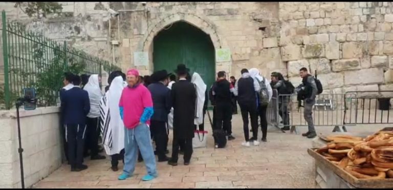 תלמידי הרב זילברמן שלא עולים להר בגלל האיסור ההלכתי, פתחו בשירה הבוקר, חול המועד פסח מול שערי הר הבית. ברקע ניתן לראות עגלות של סוחרים ערבים המוכרים חמץ