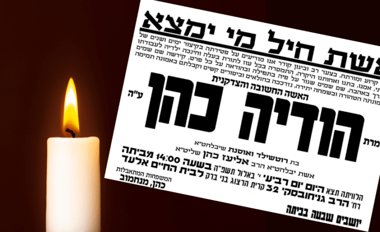 לאחר ארבע שנות מחלה קשה, הסתלקה לבית עולמה אשת החסד מרת אסתר הינדא אייכנשטיין ע"ה, שהותירה אחריה בית מלא יתומים וחובות כבדים • בעלה, תלמיד חכם ומרביץ תורה, לא יודע איך להתמודד עם העול הכלכלי הקשה. תורמים עכשיו למען עתיד היתומים