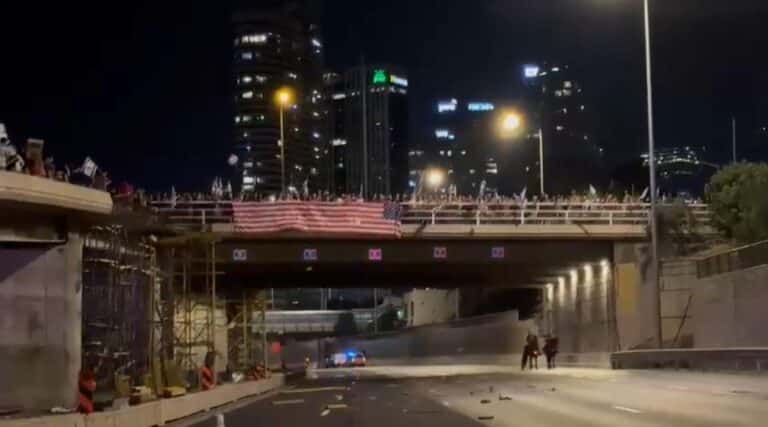 כוח משטרה העלה את המוחים חזרה לגשר יצחק מודעי לאחר שמספר מוחים החלו ביידוי אבנים והשלכת חפצים מהגשר לכביש איילון. כוח פרשים מפזר את המוחים • צפו בתיעוד שצילמו בדוברת המשטרה