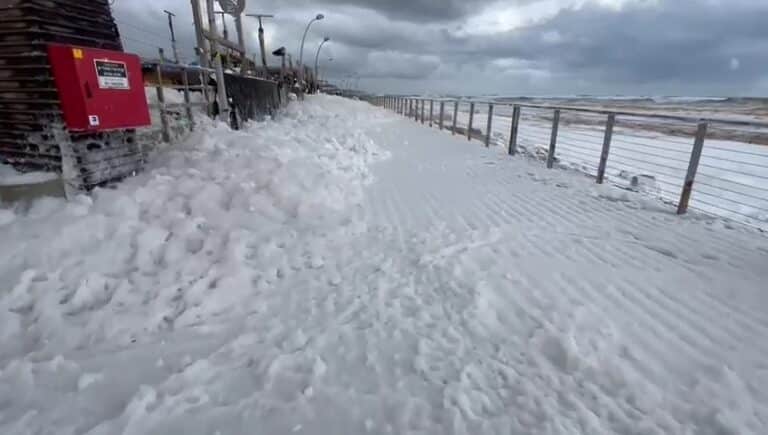 מראה לא שגרתי נראה הבוקר בחופי תל אביב, כשהחוף נצבע בלבן, בעקבות הגלים והזיהום בים שיצרו ביחד קצף שעלה אל טיילת הנמל. צפו.