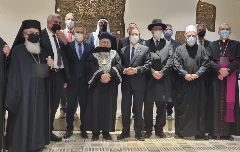 הרבנים הראשיים לישראל יחד עם מנהיגי כל הדתות בישראל נפגשו היום כדי להמליץ על חיסון ילדים נגד קורונה, הראשון לציון הגר"י יוסף ענד שרשרת כתשובה לצלב