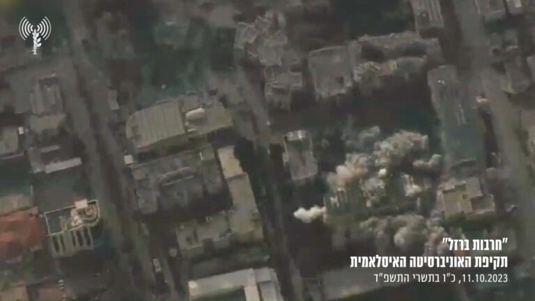 מטוסי קרב תקפו לפני זמן קצר את האוניברסיטה האסלאמית של ארגון הטרור חמאס ברצועת עזה המשמשת כמוסד הדרכה לפיתוח וייצור אמצעי לחימה • לאוניברסיטה קשרים הדוקים עם בכירי ההנהגה של חמאס ביניהם בכיר המטה הכללי של חמאס, ג'מאל זבדה, אשר חוסל במהלך מבצע "שומר החומות"